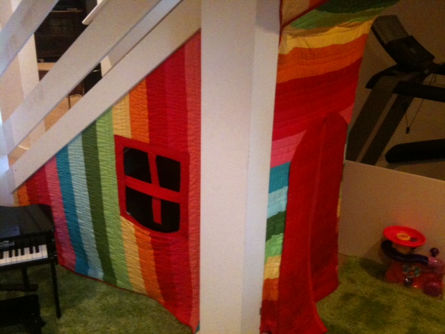 A playhouse fashioned from a kid’s quilt (believed to be from Target) complete with opening felt doorway and window. A couple of hours with a sewing machine and voila, space filled and one happy nipper ready for hours of fun. Cost-effective and brilliantly resourceful.