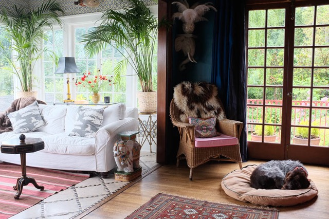Wow that is a tricky one. I think I will go with the conservatory. I adore the wallpaper, the light, the views. It is like sitting in a glass green house.  You can see the enormous evergreen trees, the wide open sky and, glimpses of the garden with the very English stonewalls within.
